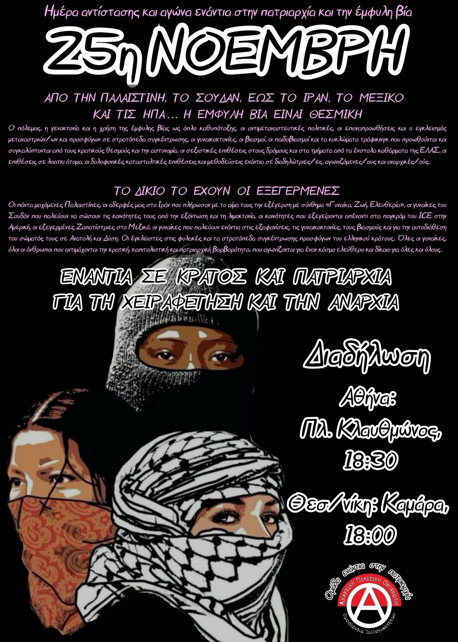 Οι πάντα μαχόμενες Παλαιστίνιες, οι αδερφές μας στο Ιράν που πλήρωσαν με το αίμα τους την εξέγερση με σύνθημα «Γυναίκα, Ζωή, Ελευθερία», οι γυναίκες του Σουδάν που παλεύουν να σώσουν τις κοινότητες τους από την εξόντωση και τη λιμοκτονία, οι κοινότητες που εξεγείρονται απέναντι στα πογκρόμ του ICE στην Αμερική, οι εξεγερμένες Ζαπατίστριες στο Μεξικό, οι γυναίκες που παλεύουν ενάντια στις εξαφανίσεις, τις γυναικοκτονίες, τους βιασμούς και για την αυτοδιάθεση του σώματός τους σε Ανατολή και Δύση. Οι έγκλειστες στις φυλακές και τα στρατόπεδα συγκέντρωσης προσφύγων του ελληνικού κράτους. Όλες οι γυναίκες, όλοι οι άνθρωποι που αντιμάχονται την κρατική, καπιταλιστική και πατριαρχική βαρβαρότητα, που αγωνίζονται για έναν κόσμο ελεύθερο και δίκαιο για όλες και όλους.