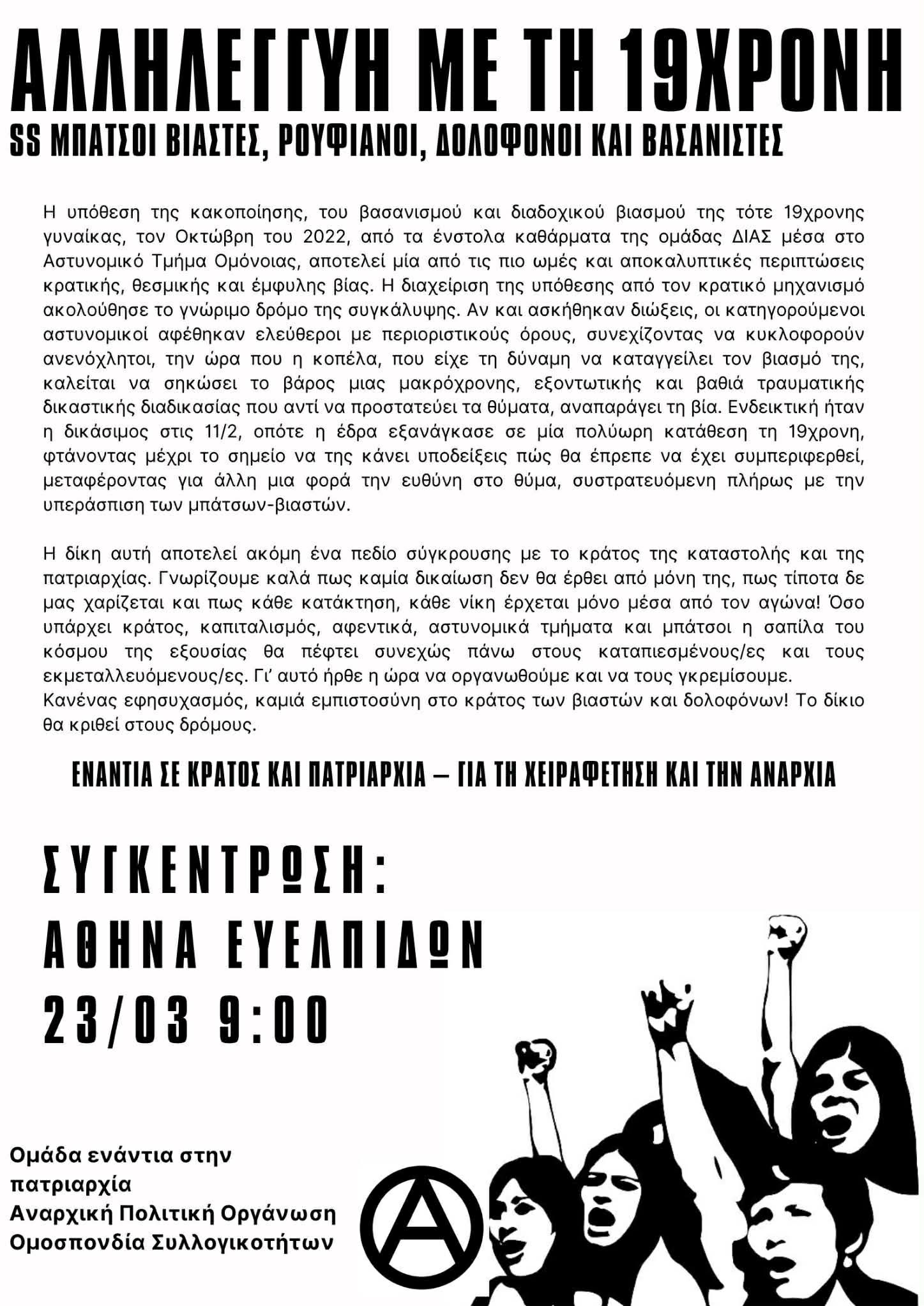 Η υπόθεση της κακοποίησης, του βασανισμού και διαδοχικού βιασμού της τότε 19χρονης γυναίκας τον Οκτώβρη του 2022 από τα ένστολα καθάρματα της ομάδας ΔΙΑΣ μέσα στο Αστυνομικό Τμήμα Ομόνοιας αποτελεί μία από τις πιο ωμές και αποκαλυπτικές περιπτώσεις κρατικής, θεσμικής και έμφυλης βίας. Η διαχείριση της υπόθεσης από τον κρατικό μηχανισμό ακολούθησε τον γνώριμο δρόμο της συγκάλυψης. Αν και ασκήθηκαν διώξεις, οι κατηγορούμενοι αστυνομικοί αφέθηκαν ελεύθεροι με περιοριστικούς όρους, συνεχίζοντας να κυκλοφορούν ανενόχλητοι, την ώρα που η κοπέλα, που είχε τη δύναμη να καταγγείλει τον βιασμό της, καλείται να σηκώσει το βάρος μιας μακρόχρονης, εξοντωτικής και βαθιά τραυματικής δικαστικής διαδικασίας που αντί να προστατεύει τα θύματα, αναπαράγει τη βία. Ενδεικτική ήταν η δικάσιμος τις 11/2 που η έδρα εκτός που εξανάγκασε σε μία πολύωρη κατάθεση τη 19χρονη, έφτασε μέχρι το σημείο να της κάνει υποδείξεις πώς θα έπρεπε να έχει συμπεριφερθεί, μεταφέροντας για άλλη μια φορά την ευθύνη στο θύμα, συστρατευόμενη πλήρως με την υπεράσπιση των μπάτσων-βιαστών.