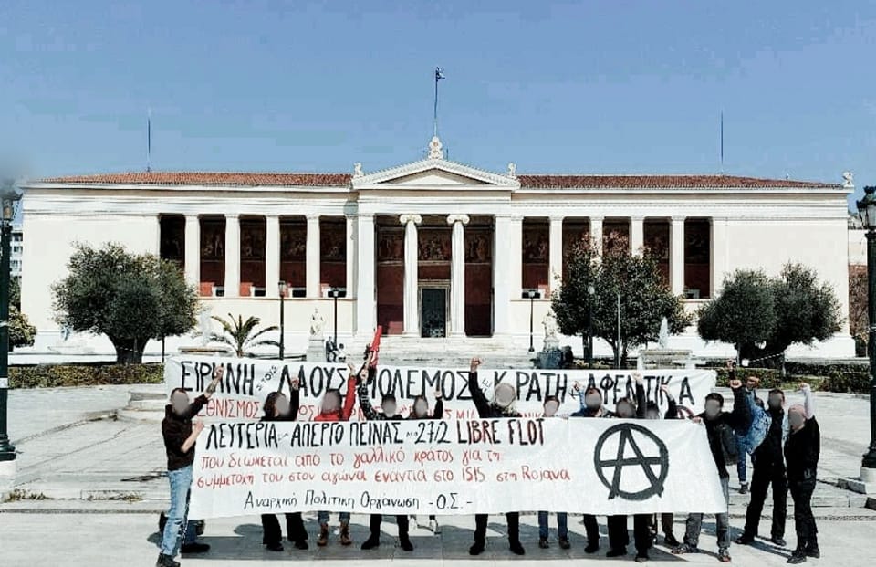 Στον αντίποδα το γαλλικό κράτος επιχειρεί να εγκληματοποίησει τόσο τους αγωνιστές που πολέμησαν στο πλευρό των Κούρδων ενάντια στο isis όσο και να καταστείλει τον αγώνα ενάντια στην κρατική και καπιταλιστική βαρβαρότητα, τον αγώνα που έχει ως πυξίδα την κοινωνική απελευθέρωση και την οικοδόμηση μιας κοινωνίας ισότητας, δικαιοσύνης και ελευθερίας. Από την πλευρά μας, ως αναρχικοί/ες, στεκόμαστε αλληλέγγυοι/ες στον δίκαιο αγώνα που διεξάγει ο απεργός πείνας Libre Flot και στέλνουμε μια υψωμένη γροθιά, αυτή των καταπιεσμένων όλης της γης, που θα γκρεμίσει τον χρεοκοπημένο κόσμο της εξουσίας.
