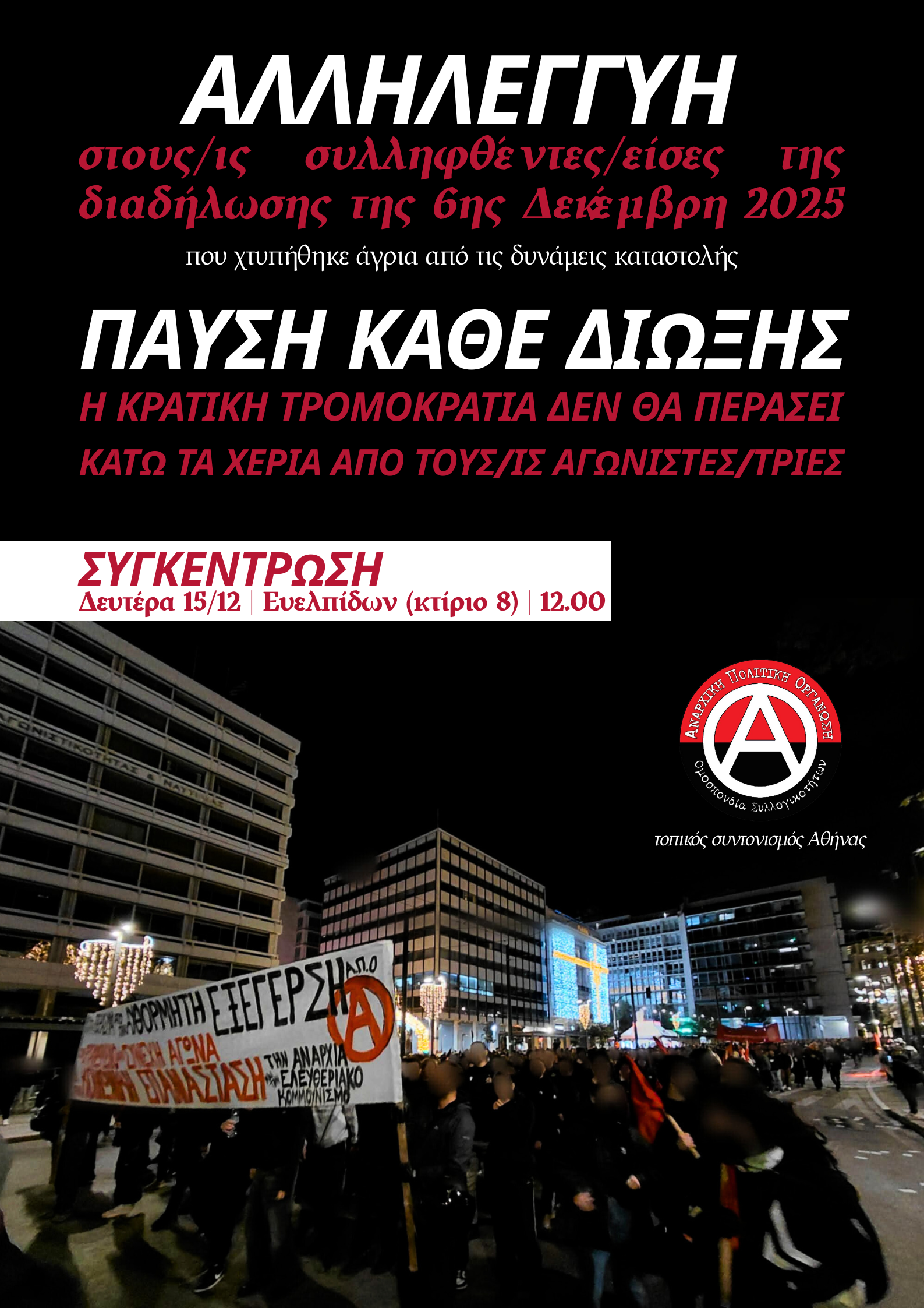 Η κατασταλτική επίθεση που δέχτηκε η πορεία της 6ης Δεκέμβρη στην Αθήνα εντάσσεται στο πλαίσιο όξυνσης της κρατικής καταστολής απέναντι στα αγωνιζόμενα κομμάτια της κοινωνίας, απέναντι στις κοινωνικές και ταξικές αντιστάσεις και ειδικότερα απέναντι στο αναρχικό κίνημα και δεν αποτελεί μεμονωμένο γεγονός. Μόνο τη μέρα της 6ης Δεκέμβρη προηγήθηκαν δεκάδες προσαγωγές, η πρωινή μαθητική – φοιτητική πορεία που αποτελούταν από αναρχικούς μαθητές/τριες και αναρχικούς φοιτητές/τριες κινήθηκε κάτω από ασφυκτικό αστυνομικό κλοιό, η στρατοπέδευση δυνάμεων κατοχής στο σημείο δολοφονίας του Αλ. Γρηγορόπουλου στα Εξάρχεια και ο αποκλεισμός και η περικύκλωση από δυνάμεις καταστολής της διαδήλωσης στη Θεσσαλονίκη για περίπου 2 ώρες, χωρίς να την αφήνουν να ολοκληρωθεί, είναι λίγα από τα πολλά παραδείγματα έντασης της κατασταλτικής εκστρατείας του κράτους και του βαθέματος του σύγχρονου ολοκληρωτισμού, για το τσάκισμα κάθε φωνής που ορθώνεται απέναντι στην κρατική και καπιταλιστική βαρβαρότητα. Αλλά και στις διαδηλώσεις του προηγούμενου διαστήματος, που χτυπήθηκαν με σφοδρότητα και σύντροφοι/ισσες και αγωνιστές/τριες βρέθηκαν αντιμέτωποι με συλλήψεις και διώξεις, όπως στην πορεία αλληλεγγύης στην Παλαιστίνη στην Αθήνα στις 7/10/25 και στην πορεία για τη μνήμη του αναρχικού αγωνιστή Κυριάκου Ξυμητήρη και σε αλληλεγγύη με τους/ις προφυλακισμένους/ες αγωνιστές/τριες για την υπόθεση των Αμπελοκήπων. Παράλληλα οι κρατικοί μηχανισμοί και σε συνεργασία με τις πρυτανικές αρχές έχουν εξαπολύσει μια σειρά διώξεων απέναντι σε αγωνιζόμενους φοιτητές/τριες, με σκοπό την επικράτηση της σιωπής μέσα και έξω από τις σχολές, όπου όποιος αντιστέκεται στις αναδιαρθρώσεις της καταστολής, του ελέγχου και της υποταγής στην τριτοβάθμια εκπαίδευση είτε θα καταδικάζεται στις δικαστικές αίθουσες, όπως στην περίπτωση του αναρχικού φοιτητή Ζ.Μ. για παρέμβαση της Πρωτοβουλίας Αναρχικών Φοιτητών/-τριών Αθήνας σε αλληλεγγύη με την Παλαιστίνη, με μηνυτή τον πρύτανη ΕΜΠ Χατζηγεωργίου και μάρτυρα κατηγορίας τον κοσμήτορα Τσανάκα, είτε θα απειλούνται με πειθαρχικά και διαγραφές όπως οι φοιτητές/τριες της Αρχιτεκτονικής ΕΜΠ, που κατέλαβαν την σχολή τους.