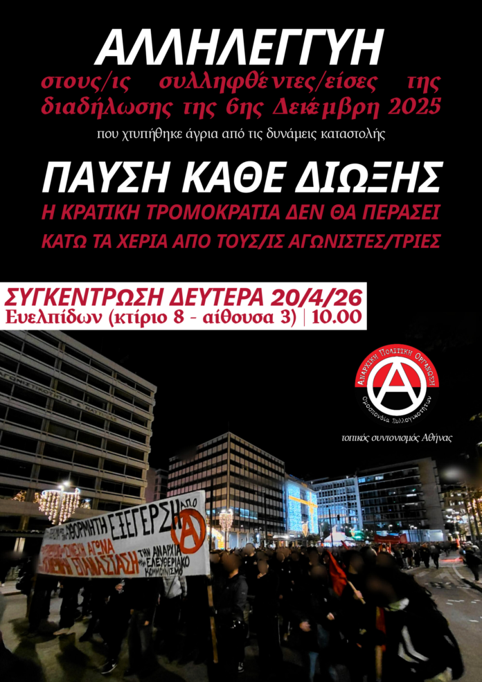 Τη Δευτέρα 20 Απρίλη 2026 έχει οριστεί η δίκη των συλληφθέντων/εισών της διαδήλωσης της 6ης Δεκέμβρη 2025 στην Αθήνα, για τα 17 χρόνια από την κρατική δολοφονία του Αλέξανδρου Γρηγορόπουλου και την κοινωνική εξέγερση του Δεκέμβρη ’08. Οι συλληφθέντες/είσες αντιμετωπίζουν σωρεία πλημμελημάτων και πιο συγκεκριμένα: διατάραξη κοινής ειρήνης, αντίσταση, απείθεια, άρνηση δακτυλοσκόπησης, εξύβριση, παράνομη οπλοφορία, βία κατά υπαλλήλων, απόπειρα επικίνδυνης σωματικής βλάβης και διακεκριμένη φθορά. Το βαρύ και στημένο κατηγορητήριο με το οποίο έρχονται αντιμέτωποι οι σύντροφοι και συντρόφισσες δεν είναι τίποτα παραπάνω από την αποτύπωση του εκδικητικού μένους του κρατικού μηχανισμού απέναντι σε όσους και όσες συνεχίζουν να κρατούν το δρόμο ανοιχτό σε μια περίοδο οξυμένης καταστολής και επίτασης των όρων εκμετάλλευσης στους από τα κάτω σε κάθε πεδίο της καθημερινότητας, ενώ ταυτόχρονα καταδεικνύει την ένταση της κρατικής κατασταλτικής επίθεσης που δέχτηκε η διαδήλωση της 6ης Δεκέμβρη, με άμεσο σκοπό των κρατικών επιτελείων την τρομοκράτηση όσων βρέθηκαν στο δρόμο, όσων δεν ήταν εκεί αλλά είδαν τη μανία των ένστολων καθαρμάτων απέναντι στα σώματα των διαδηλωτών και όσων ακόμα κρατούν αναμμένη τη φλόγα του Δεκέμβρη και ζωντανά τα προτάγματά του, της εξέγερσης, της κοινωνικής αυτοοργάνωσης, της ταξικής αλληλεγγύης, της μαχητικής αντίστασης και το όραμα της Κοινωνικής Επανάστασης.