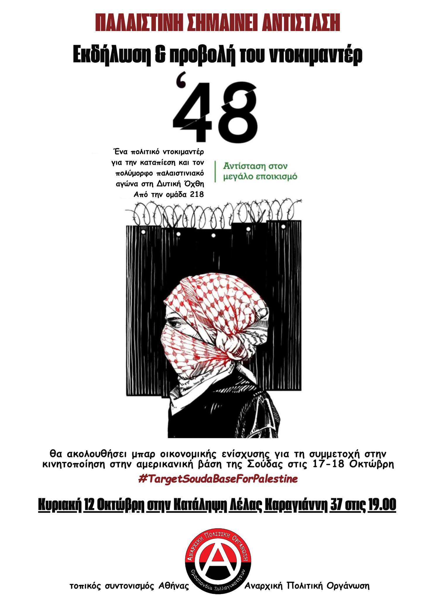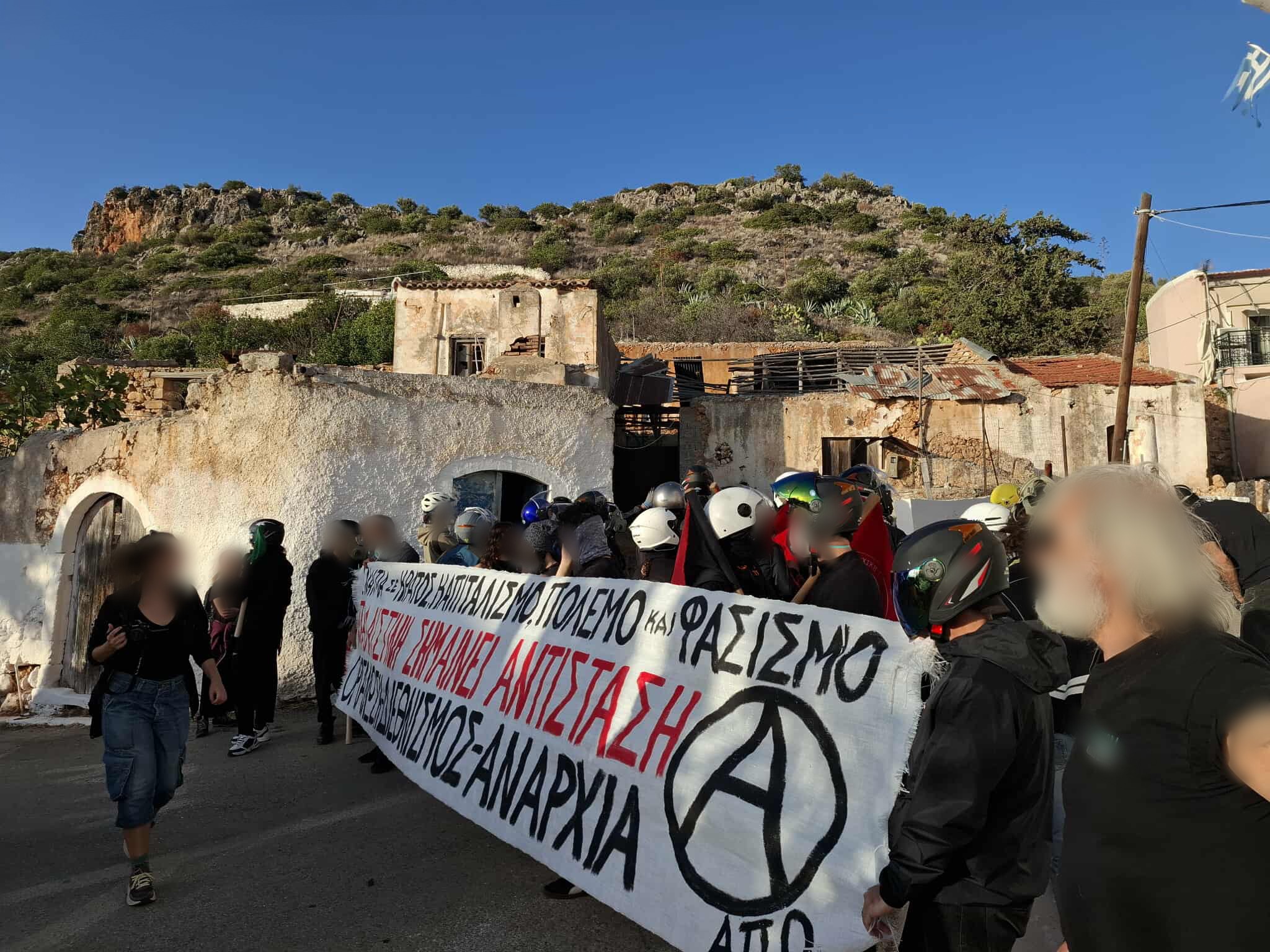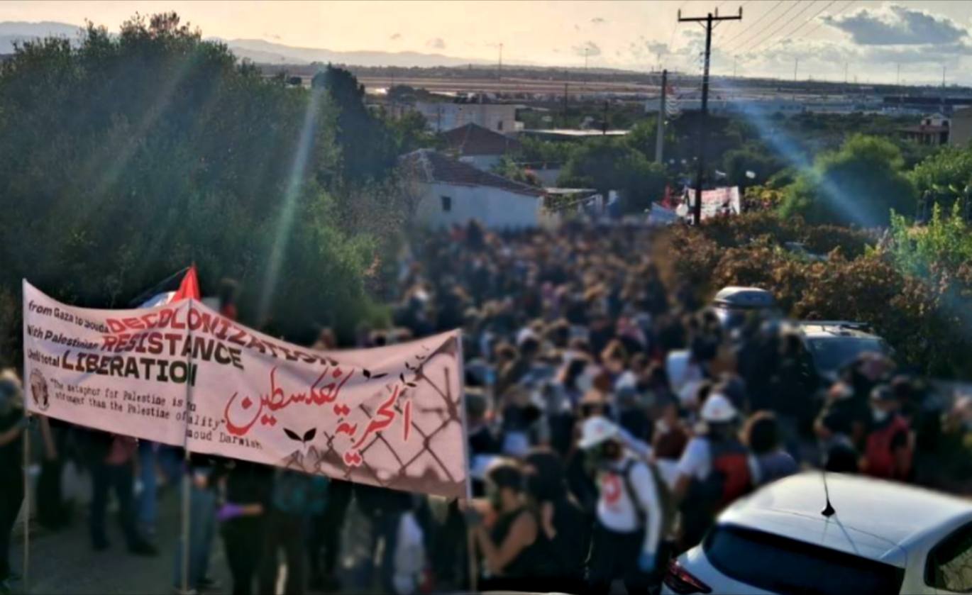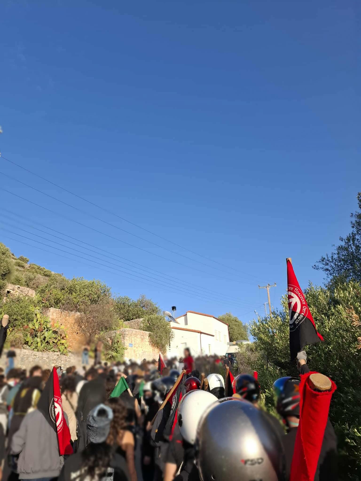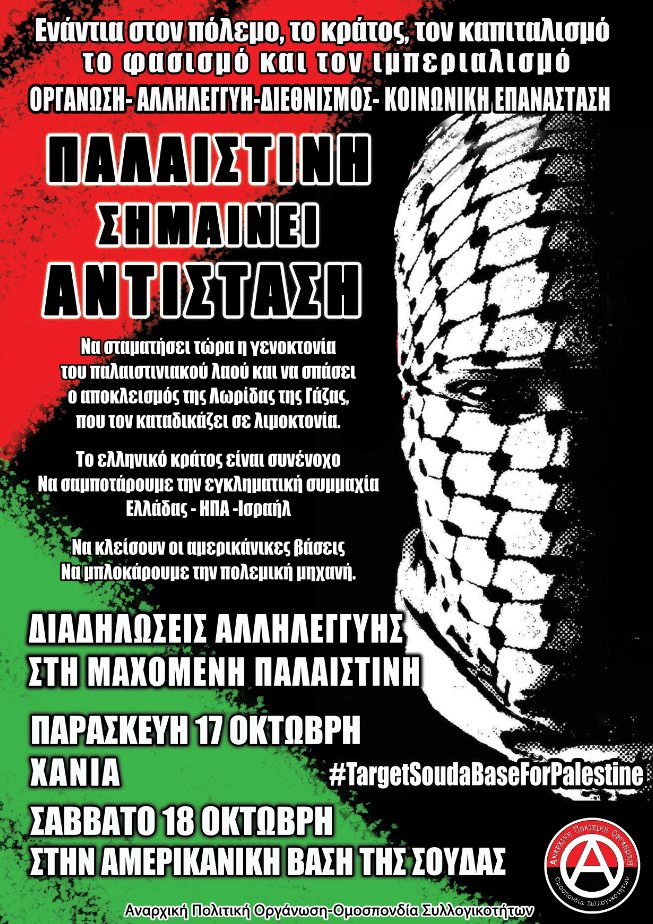 Στις 17 και 18 Οκτώβρη πραγματοποιήθηκε με μαζική συμμετοχή η πανελλαδική κινητοποίηση αλληλεγγύης στον μαχόμενο παλαιστινιακό λαό στην πόλη των Χανίων και στην στρατιωτική αμερικάνικη βάση της Σούδας, αποτελώντας την κορύφωση της καμπάνιας target souda base for Palestine, που οργανώθηκε με πρωτοβουλία του Παγκρήτιου Συντονιστικού για την Παλαιστίνη. Το απόγευμα της Παρασκευής 17/10 πραγματοποιήθηκε με τη συμμετοχή περισσότερων απο 1500 διαδηλωτών/τριών συγκέντρωση στην πλατεία Αγοράς και πορεία στους δρόμους της πόλης, στέλνοντας το μήνυμα της διεθνιστικής αλληλεγγύης και στοχοποιώντας το ελληνικό κράτος για τη συνενοχή του στη γενοκτονία των Παλαιστίνιων από το Ισραήλ. Το μεσημέρι του Σαββατού 18/10, ύστερα απο συγκέντρωση στο πάρκο Ειρήνης και Φιλίας, ξεκίνησε μεγάλο κομβόι από δεκάδες αυτοκίνητα, μηχανές και πούλμαν προς το χωριό Μουζουράς, το οποίο απέχει λίγα χιλιόμετρα από τις βάσεις και αποτελούσε το σημείο συγκέντρωσης του συνόλου των διαδηλωτών που ανά εκατοντάδες έφταναν από άλλες πόλεις της Κρήτης. Η διαδήλωση συγκροτήθηκε στους δρόμους του χωριού νωρίς το απόγευμα, με το κοινό μπλοκ των συντρόφων/ισσών άπω την Κρήτη και των αναρχικών, αντιεξουσιαστικών και ελευθεριακών συλλογικοτήτων που συμμετείχαν πανελλαδικά να βρίσκεται στην κεφαλή της πορείας ενώ ακολουθούσαν τα μπλοκ φοιτητικών συλλόγων, αριστερών οργανώσεων και πρωτοβουλιών αγώνα. Η διαδήλωση με δυναμισμό και μεγάλη μαζικότητα κατευθύνθηκε προς την αμερικάνικη αεροπορική στρατιωτική βάση, που αποτελεί διαχρονικά ένα ορμητήριο πολέμου που συμβολίζει και εξυπηρετεί τη διατήρηση της αμερικάνικης και ευρωατλαντικής κυριαρχίας και κηδεμονίας στη νευραλγική περιοχή της ανατολικής μεσογείου, ενώ στο σημείο διασταύρωσης του δρόμου με τα πρώτα συρματοπλέγματα της βάσης οι διαδηλωτές/τριες βρέθηκαν απέναντι από τον φραγμό των ένστολων δολοφόνων του ελληνικού κράτους.