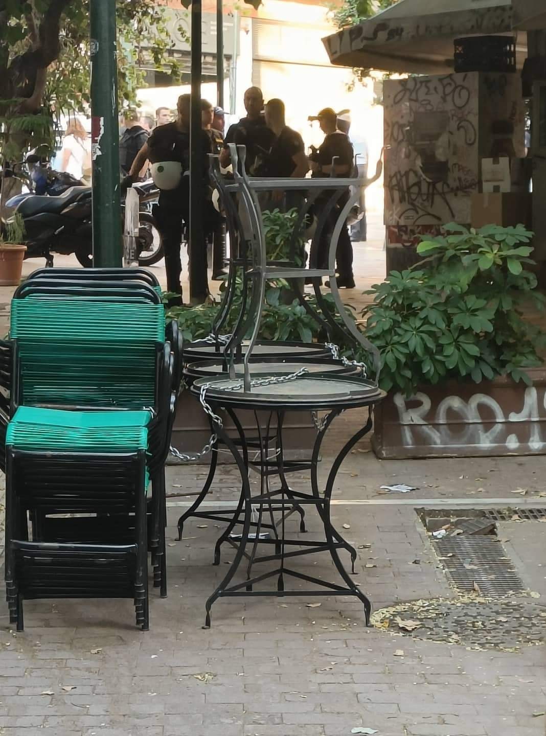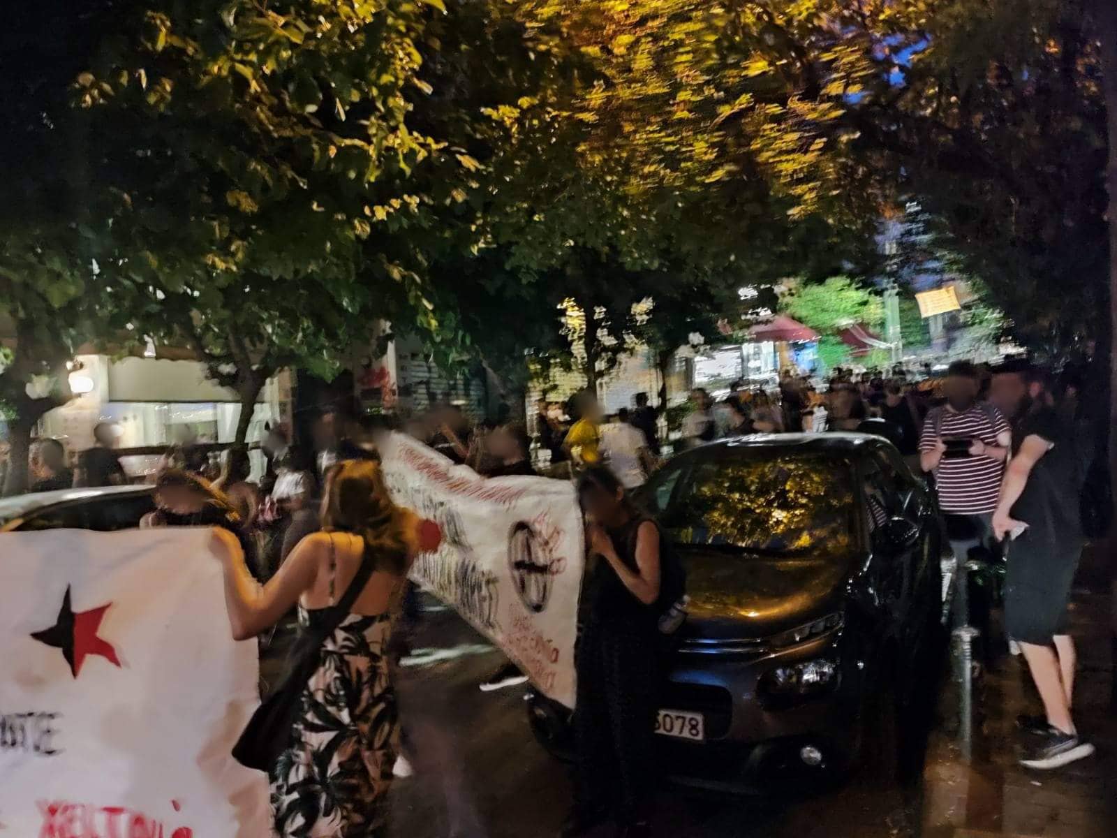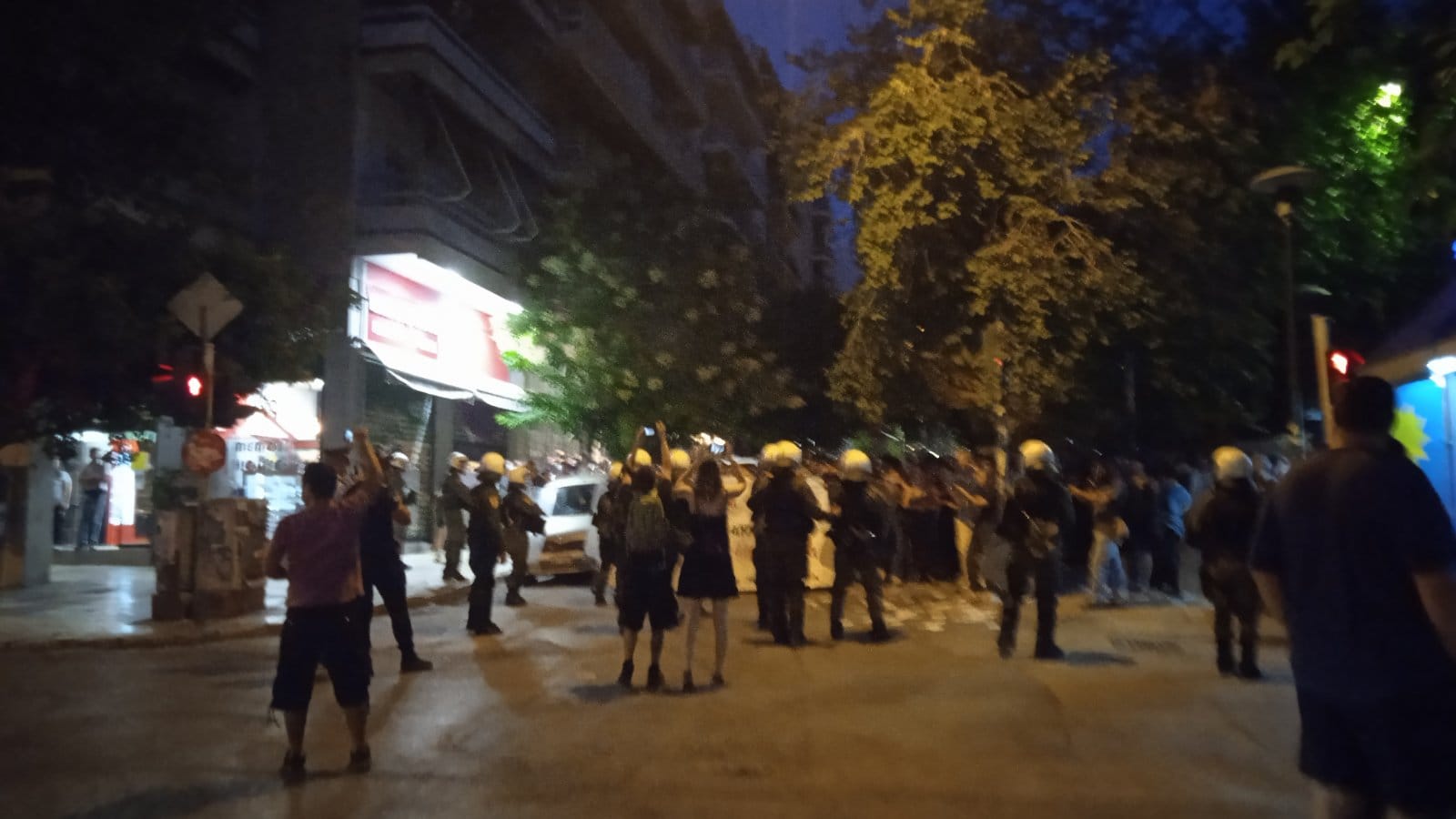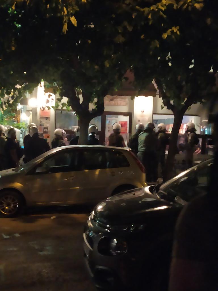 Όσην ώρα οι προσαχθέντες οδηγούνται στις κλούβες αντηχούν συνθήματα. Καμία μόνη – κανένας μόνος απέναντι στην κρατική καταστολή. Οι συντρόφισσες μέσα στο καφενείο αρνούνται να τους γίνει σωματικός έλεγχος από τους άντρες αστυνομικούς και έτσι μπλοκάρει η διαδικασία προσαγωγής τους.
