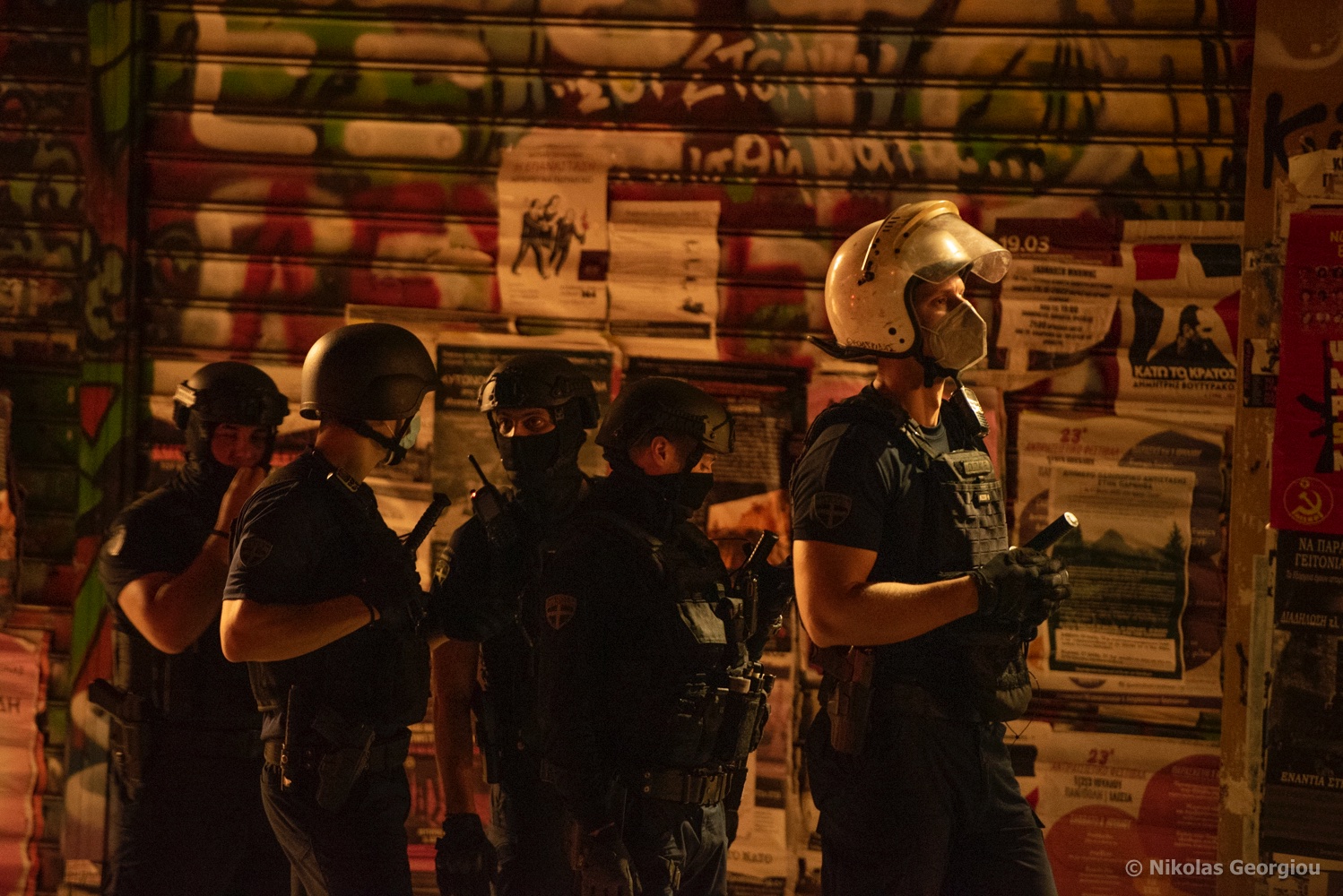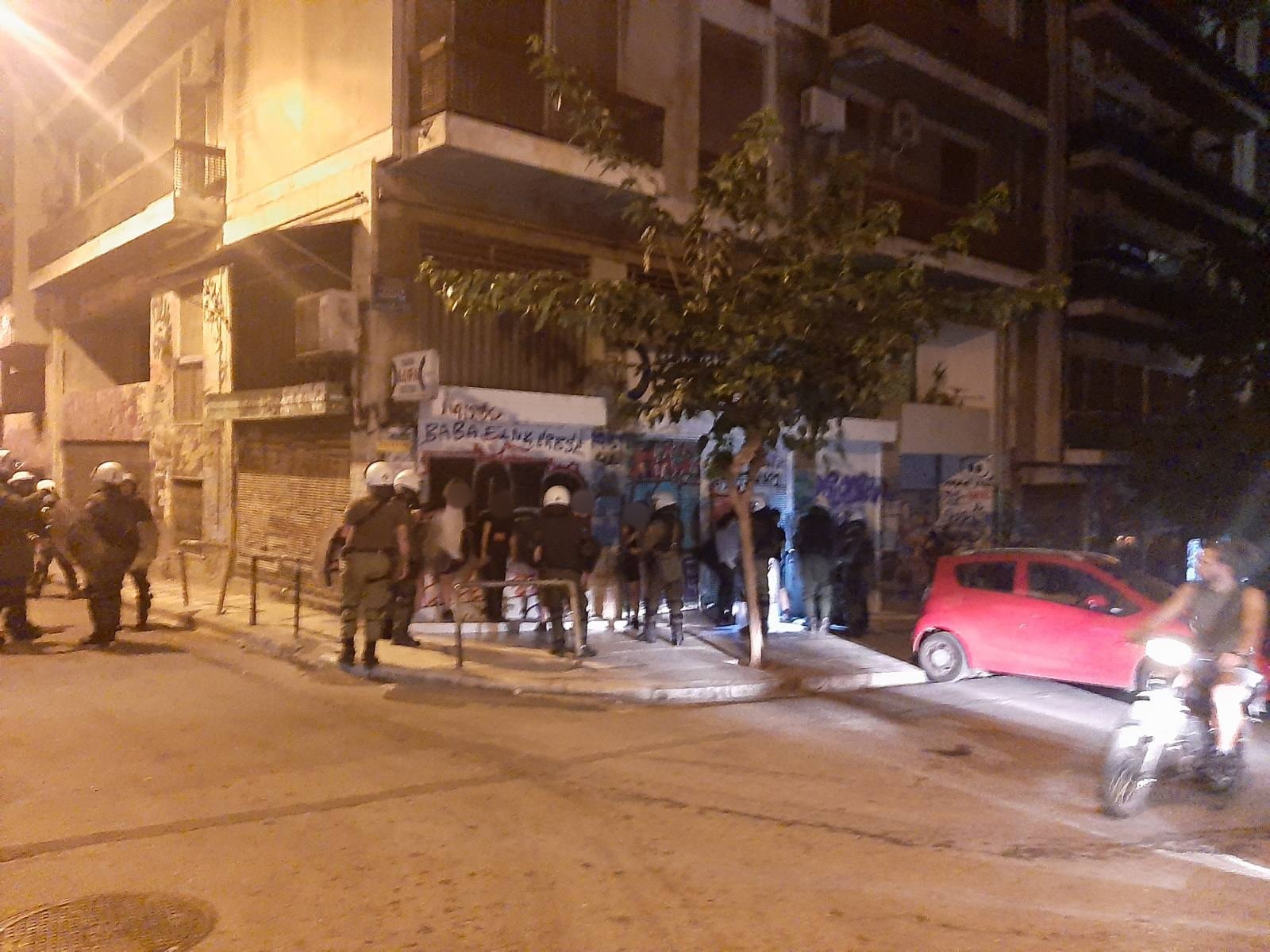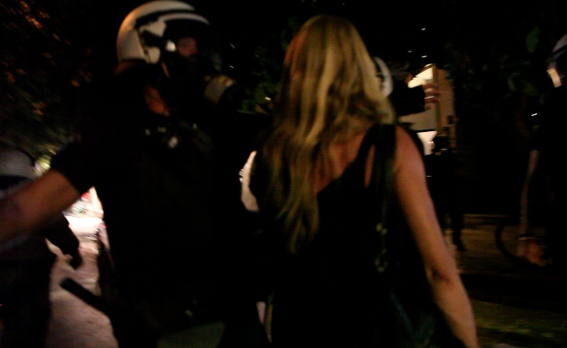 Για περισσότερες από δύο ώρες, όσο διαρκεί η επιχείρηση εκκένωσης, συγκεντρωνόμαστε μπροστά στον αστυνομικό φραγμό (Στουρνάρη και Οικονόμου). Συντρόφισσες και σύντροφοι, ανοίγουμε το πανό και αρνούμαστε να εγκαταλείψουμε το σημείο, φωνάζοντας συνθήματα αλληλεγγύης απέναντι στην κρατική τρομοκρατία. Ο κόσμος πληθαίνει. Ένας από τους ΜΑΤατζήδες που είναι παραταγμένος στο ένα μέτρο μπροστά από το πανό μας, μας απειλεί με το όπλο του. Για μια ακόμη φορά, δεν υποχωρούμε.