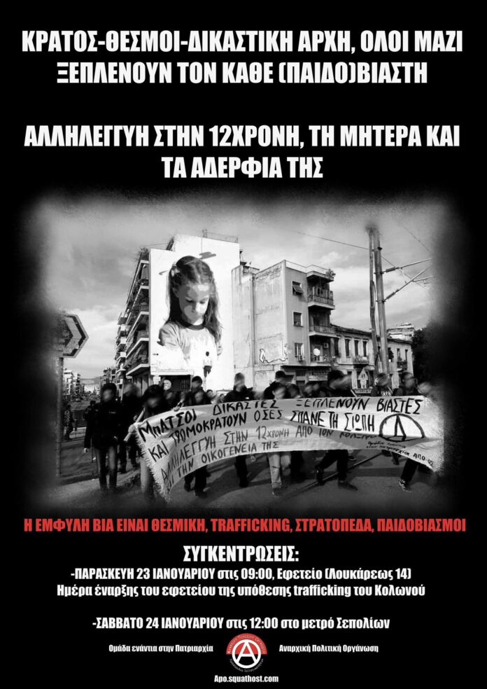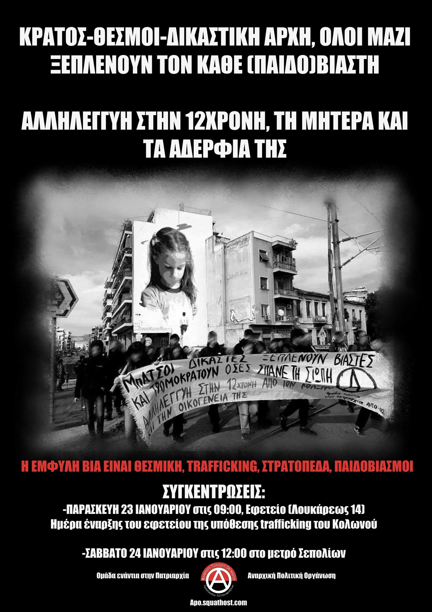 Στις 23 Γενάρη του 2026, ξεκινά η εκδίκαση σε δεύτερο βαθμό της υπόθεσης της τότε 12χρονης από τον Κολωνό ενάντια στο κύκλωμα trafficking που την εξέδιδε και την κακοποιούσε. Η απόφαση του πρωτόδικου δικαστηρίου, έπειτα από τη συνεχή και δυναμική κινητοποίηση αλληλέγγυου κόσμου, είχε δικαιώσει τη 12χρονη κοπέλα και την οικογένειά της, απαλλάσσοντας τη μητέρα από το στημένο κατηγορητήριο που της είχε αποδοθεί και καταδικάζοντας τον παιδοβιαστή και μαστροπό Ηλία Μίχο και τον αποκαλούμενο «Μιχάλη» καθώς και άλλους 16 κατηγορούμενους -που χαρακτηρίστηκαν ως «πελάτες» – για βιασμό ανήλικου έναντι αμοιβής. Επίσης, κατά τη δεύτερη δίκη που προέκυψε από τη δεύτερη δικογραφία που σχηματίστηκε, καταδικάστηκαν 11 ακόμα παιδοβιαστές- από το σύνολο των 17 κατηγορούμενων.