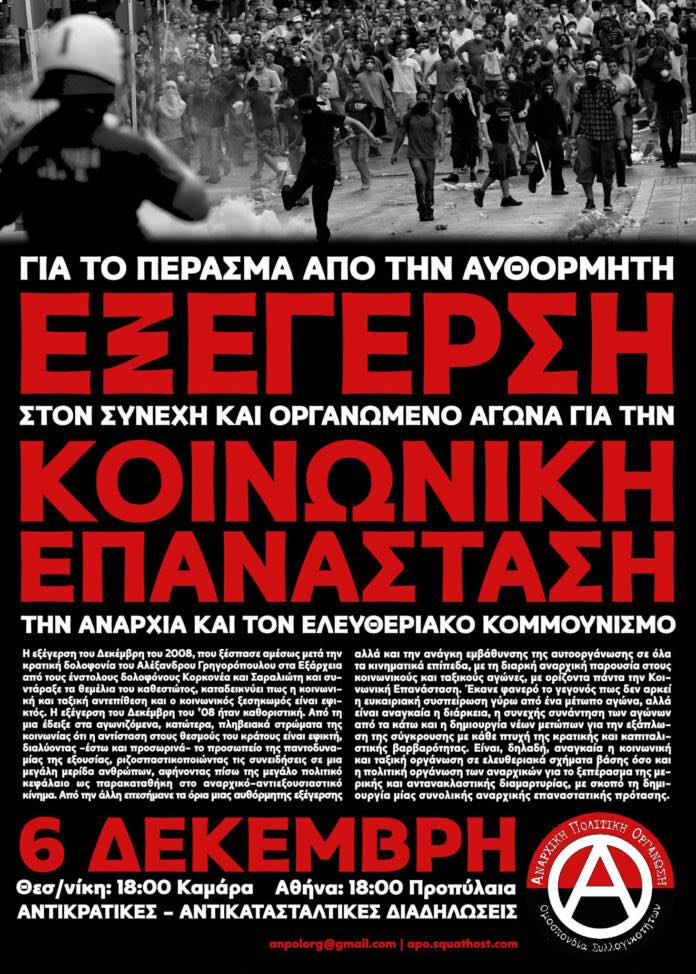 Δεκαεφτά χρόνια μετά την εξέγερση του Δεκέμβρη, κράτος και αφεντικά συνεχίζουν να προωθούν ακόμα πιο εντατικά τη λεηλασία της κοινωνικής βάσης και την άγρια καταστολή των κοινωνικών και ταξικών αντιστάσεων. Οι εκμεταλλευόμενοι και οι καταπιεσμένοι συνεχίζουν να πληρώνουν με το αίμα τους τη διατήρηση και αναπαραγωγή του βάρβαρου εκμεταλλευτικού και καταπιεστικού συστήματος, που καταδυναστεύει, δολοφονεί, εξαθλιώνει και καταστρέφει τις κοινωνίες και τον φυσικό κόσμο.