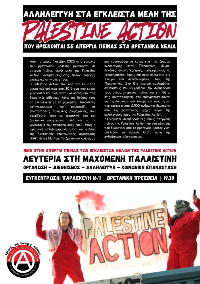 Αλληλεγγύη στα έγκλειστα μέλη της Palestine Action, που βρίσκονται σε απεργία πείνας στα βρετανικά κελιά