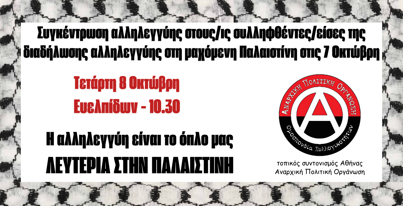 Συγκέντρωση αλληλεγγύης στους/ις συλληφθέντες/είσες της διαδήλωσης αλληλεγγύης στη μαχόμενη Παλαιστίνη στις 7 Οκτώβρη