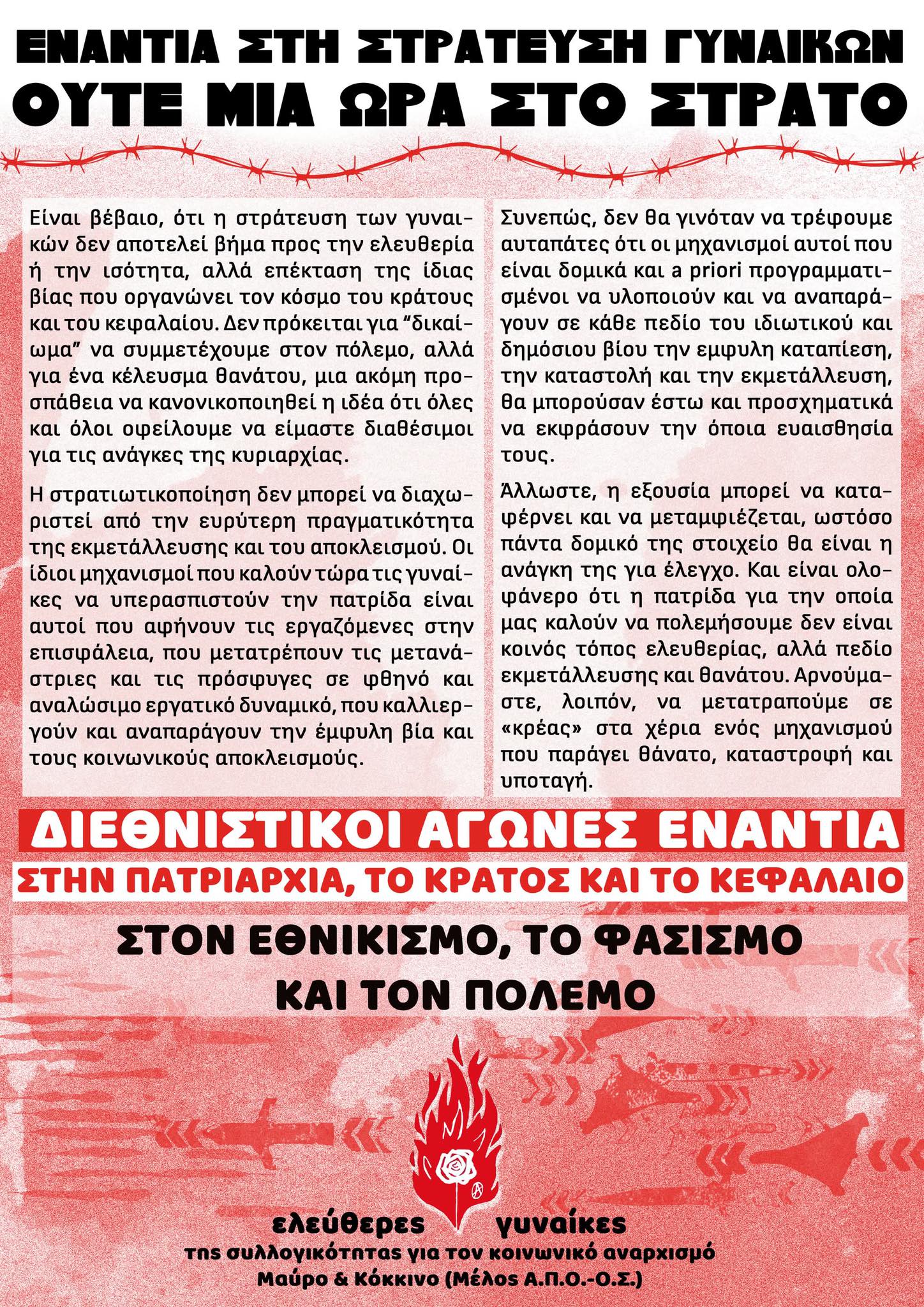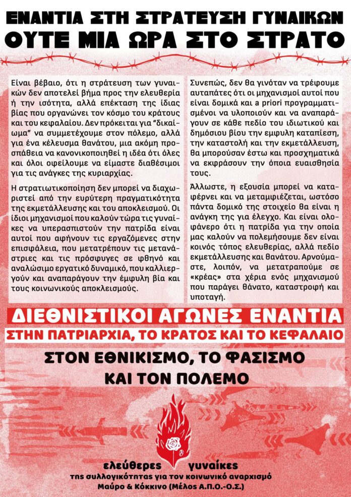 Είναι βέβαιο, ότι η στράτευση των γυναικών δεν αποτελεί βήμα προς την ελευθερία ή την ισότητα, αλλά επέκταση της ίδιας βίας που οργανώνει τον κόσμο του κράτους και του κεφαλαίου. Δεν πρόκειται για “δικαίωμα” να συμμετέχουμε στον πόλεμο, αλλά για ένα κέλευσμα θανάτου, μια ακόμη προσπάθεια να κανονικοποιηθεί η ιδέα ότι όλες και όλοι οφείλουμε να είμαστε διαθέσιμοι για τις ανάγκες της κυριαρχίας. Δεν είναι τυχαίο ότι η εθελοντική αυτή κατάταξη στον στρατό παρουσιάζεται ως στοιχείο συστατικό για την εθνική ανεξάρτητη ύπαρξη, ως μια θητεία-«ευκαιρία» και παράλληλα ως μια νομοτελειακή συνέχεια του «ένδοξου ελληνικού παρελθόντος» και ευθύνη σε μια περίοδο όπου οι «διαρκώς μεταβαλλόμενες συνθήκες δημιουργούν και νέες απαιτήσεις». Ακριβώς σε αυτές τις συνθήκες της γενίκευσης του σύγχρονου ολοκληρωτισμού, της καθημερινής φτωχοποίησης και της αποκρυστάλλωσης του δυστοπικού μωσαϊκού εκμετάλλευσης, η λεγόμενη ισότητα των φύλων, αξιοποιείται κάτω από τον μανδύα του εκδημοκρατισμού από το κράτος και τους μηχανισμούς του ως εργαλείο αναπαραγωγής των ιεραρχιών και απόσπασης της συναίνεσης. Μεθοδεύεται έτσι μια γεφύρωση των κοινωνικών συγκρούσεων κάτω από ομπρέλες «συμπερίληψης», « εθνικής τιμής» και «προσφοράς», ρυθμίζοντας ταυτόχρονα κανονιστικά τα σωματά μας, προετοιμάζοντας την κοινωνική βάση ως «προορισμένη» να αποτελεί κομμάτι μιας συλλογικής στρατιωτικής μηχανής. Με αυτόν τον τρόπο οι γυναίκες αποκαθίστανται δήθεν ως δρώντα υποκείμενα, ενώ στην πραγματικότητα προσκαλούνται να ενσωματωθούν ακριβώς σε αυτές τις ανάγκες της επικυριαρχίας κράτους και κεφαλαίου και να περιφρουρήσουν το συντηρητικοποιημένο πλέγμα των κοινωνικών σχέσεων που μας καλεί να λάβουμε «θέσεις μάχης».
