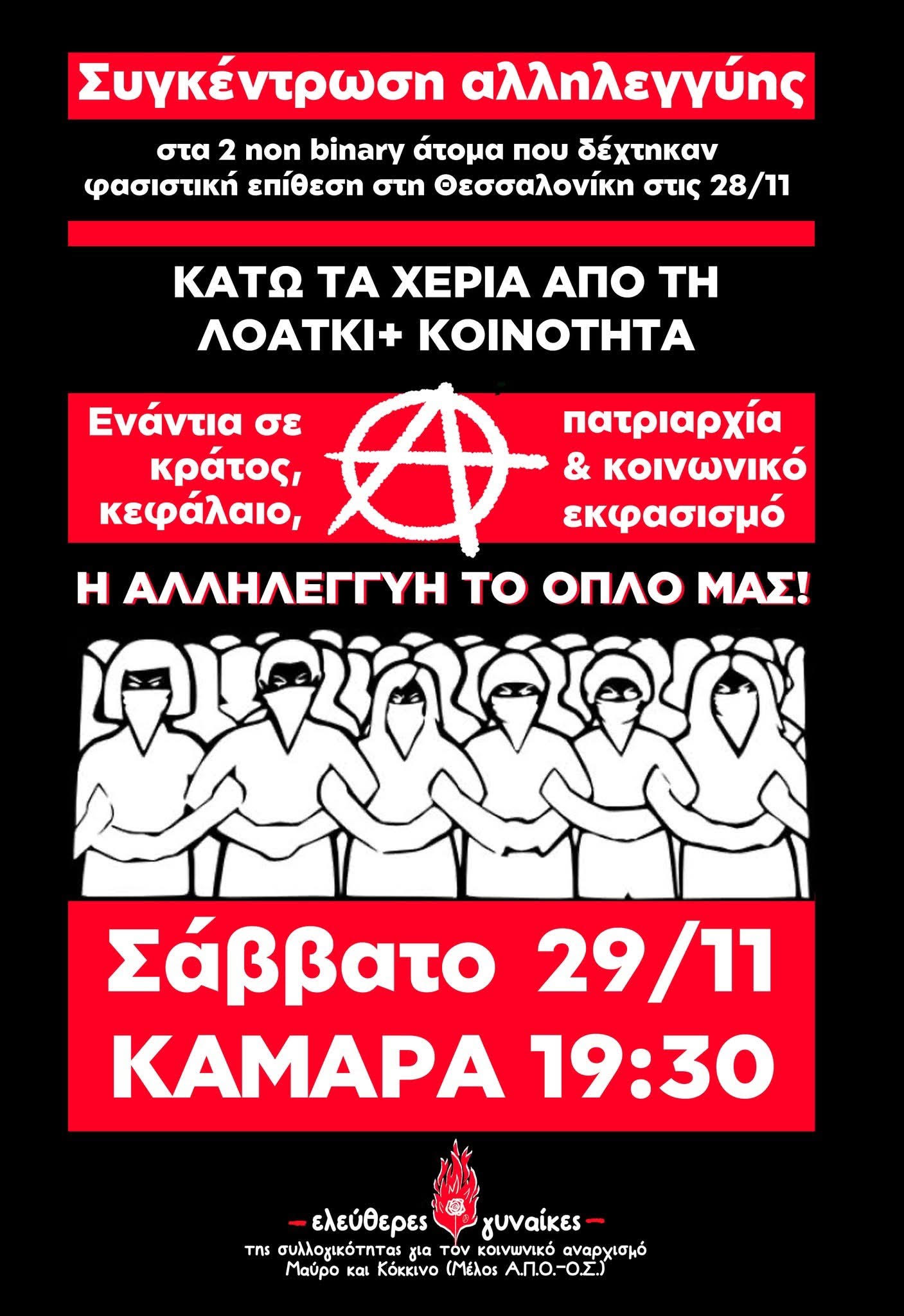Εκδηλώσεις-ΚαλέσματαΚεντρικό ΆρθροΣΥΛΛΟΓΙΚΟΤΗΤΕΣσυλλογικότητα για τον κοινωνικό αναρχισμό "Μαύρο & Κόκκινο" [Θεσ/νίκη] Συγκέντρωση Αλληλεγγύης στα 2 non binary άτομα που δέχτηκαν φασιστική επίθεση στη Θεσσαλονίκη στις 28/11 By A.P.O. - November 29, 2025 0 21 FacebookTwitterPinterestWhatsApp ΚΑΤΩ ΤΑ ΧΕΡΙΑ ΑΠΟ ΤΗ ΛΟΑΤΚΙ+ ΚΟΙΝΟΤΗΤΑ Ενάντια σε κράτος, κεφάλαιο, πατριαρχία & κοινωνικό εκφασισμό Η ΑΛΛΗΛΕΓΓΥΗ ΤΟ ΟΠΛΟ ΜΑΣ! ΣΑΒΒΑΤΟ 29/11, ΚΑΜΑΡΑ 19.30 Ελεύθερες γυναίκες, της συλλογικότητας για τον Κοινωνικό Αναρχισμό Μαύρο και Κόκκινο